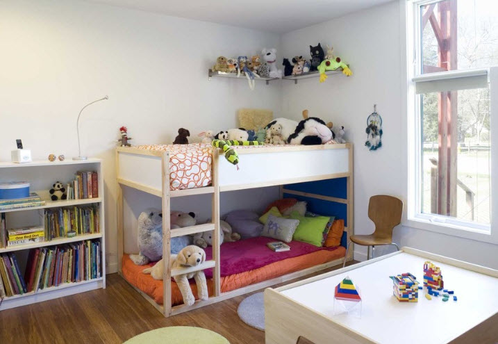 А вот такой стиль как минимализм в большей степени подойдет для детей более старшего возраста, так как кровать в этом стиле будет малогабаритной и остается много пространства для игровой зоны. Для того чтобы разместить гардероб, полочки, стеллажи и при этом выиграть в пространстве, разумно использовать комбинированные двухъярусные кровати или кровати-трансформеры. Эти варианты выигрышны в небольших детских комнатах.
