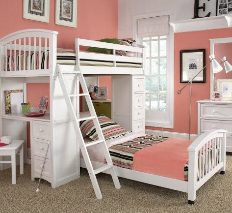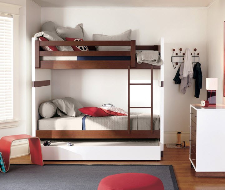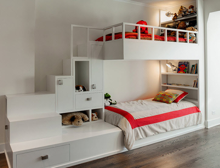 Двухъярусные кровати, рассчитанные на двух детей, помогут создать два полноценных спальных места, задействовав минимальную площадь комнаты. Обычно родители наверху располагают детей старшего возраста, а малышам отводят более безопасный первый этаж. Такие двухъярусные кровати также бывают нескольких видов: