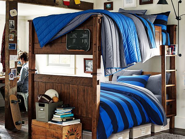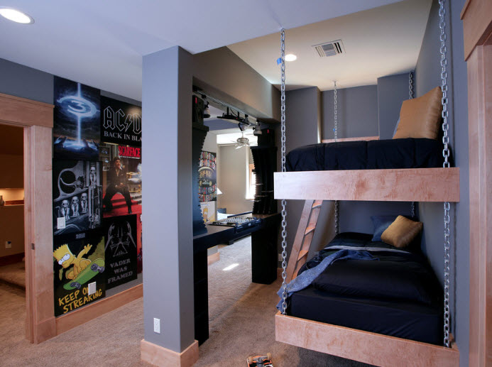 Двухэтажная кровать помогает оборудовать комнату первыми спортивными снаряжениями: шведская мини-стенка, канат для лазания, невысокий турник или даже горка, — этот, казалось бы, маленький и незаметный уголок юного спортсмена с годами сделает ребенка гораздо крепче и сильнее.