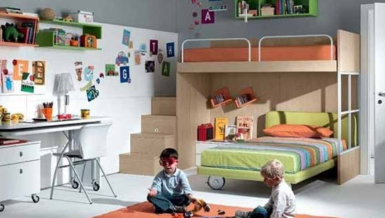 В настоящее время на рынке мебели огромное количество вариантов двухъярусных кроватей для детей, начиная от обычной классики и заканчивая неординарными моделями. Выбор огромен, поэтому купить детям нравящуюся модель и при этом рационально заполнить детскую комнату родителям труда не составит. Подходите к выбору двухъярусной кровати творчески, обращайте внимание на дополнительные модули к ней: шкафы, уголки, стеллажи, игровые элементы. В итоге получится целый комплекс, от которого дети будут в восторге!