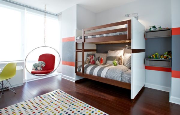 Если ваши дети растут эстетами и уже предъявляют определённые требования к интерьеру, вас может заинтересовать вариант на фотографии ниже. Как можно заметить, дизайнеры создали своеобразное «царство геометрии» с элегантной цветовой гаммой. Всё пространство сформировано с помощью чётких линий и правильных фигур. В нём даже ограждения верхнего яруса кровати являются неотделимым элементом дизайна, а потрясающее кресло в круглой капсуле смотрится, как его завершающий и эффектный штрих.
