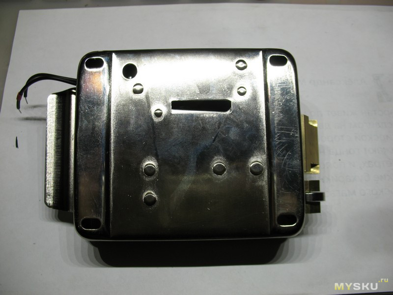 Кодовая панель это замечательно, но она ничто без исполнительного устройства. А в качестве собственно замка я выбрал огромную дуру, а которой и хочу рассказать. Заранее прощу прощения за незнание терминологии и большое количество плохих фото. Начну традиционно с критериев выбора. Хотелось возможность открыть снаружи да и изнутри не только электрически, но и механически, ну и по возможности блокировать возможность открытия совсем. Данный замок — один из немногих кто имеет замочные скважины с обеих сторон, причем назначение для неспециалиста было не совсем понятно. На тот момент были «лишние» деньги на эксперименты — было решено рискнуть.