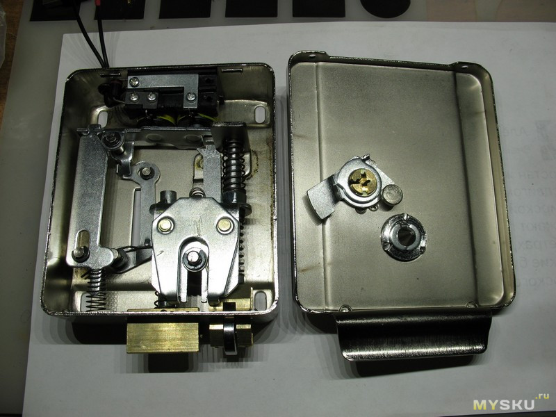 Видите на последнем фото прямоугольное отверстие почти в центре? Это для открывания снаружи. в него вставляется «хвост» наружного цилиндра, и при поворачивании надавливает на рычажок, который тоже чуть-чуть виден а этом отверстии, таким образом открывая замок.