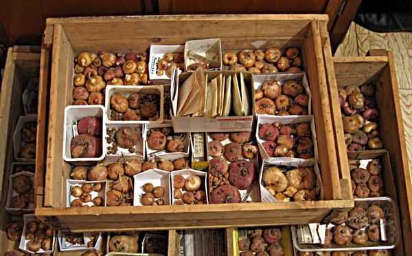 Гладиолусы нужно выкапывать из земли каждую осень, а весной опять высаживать в цветник. Цветение гладиолусов в следующем сезоне зависит от того, когда вы их выкопаете, как подготовите к хранению и в каких условиях будете хранить их до следующей посадки. Мы расскажем вам о том, как и когда выкапывать луковицы гладиолусов и как хранить гладиолусы зимой. Когда выкапывать луковицы гладиолусов из земли, зависит от сроков их цветения и времени, когда было срезано соцветие. С момента срезки гладиолусов раннего и среднего сроков цветения до полного созревания их луковиц должно пройти 30-40 дней, а для созревания луковицы позднего сорта – 45-50 дней. Если у вас много гладиолусов, то придется завести дневник, в котором вы будете отмечать, когда был срезан тот или иной гладиолус, чтобы вычислить день, когда созреет луковица. Если соцветие не срезают, то срок созревания луковицы этого гладиолуса увеличивается еще на две-три недели. В среднем выкапывание начинают с середины сентября. Не так страшно, если луковицы окажутся слегка недозрелыми, хуже, если детки успеют отделиться от созревшей материнской луковицы, и вам придется их искать: оставшиеся в земле дочерние луковички погибнут при -10 ºC. Работу по извлечению луковиц из земли лучше проводить в солнечную погоду. Сначала убирают луковицы средних и ранних сортов, а только потом поздних. Причем первыми нужно извлечь из земли луковицы темноокрашенных гладиолусов – вишнево-красных, фиолетовых или лавандово-голубых, поскольку они раньше других гладиолусов теряют иммунитет к грибковым болезням. Гладиолусы, выращенные из деток, убирают последними. Подденьте лопатой кустик и вытащите растение из земли, затем обрежьте острым инструментом наземную часть на расстоянии 1-2 см от луковицы. Затем разложите клубнелуковицы на неделю под навесом для просушки. После просушивания отделите от материнских луковиц деток, очистите луковицы от корней и верхней кроющей чешуи, затем протравите посадочный материал в течение часа в насыщенном растворе перманганата калия и хорошо просушите, поместив в капроновые или марлевые мешочки и подвесив к потолку в теплом помещении с хорошей вентиляцией. В мешочки для отпугивания вредителей и уничтожения инфекций добавляют несколько очищенных от шелухи и вымытых зубков чеснока. Две недели луковицы должны сохнуть при температуре 25-30 ºC, а затем их в течение месяца досушивают при комнатной температуре. Деток кладут на полиэтиленовую пленку и подсушивают в тени, после чего просеивают через сито с ячейками 5 мм для отсева самых мелких клубнепочек, из которых могут вырасти только слабые растения. Мешочки с луковицами гладиолусов складывают в коробки или ящики и хранят в сухом подвале при 3-10 ºC, не позволяя температуре опуститься ниже 2 ºC. В зимнее время 1-2 раза в месяц следует проверять состояние хранящегося посадочного материала и своевременно удалять больные луковицы, чтобы они не заржали здоровые. Если вы обнаружили на луковицах серую плесень, это значит, что в помещении слишком высокая влажность воздуха. Чтобы ее понииизить, следует проветрить помещение и разложить в ящики гидрофобные материалы – перлит, вермикулит или селикогель. Заплесневелые луковицы нужно протереть ватным диском, смоченным водкой, затем хорошо просушить. Деток хранят отдельно в стеклянной или пл