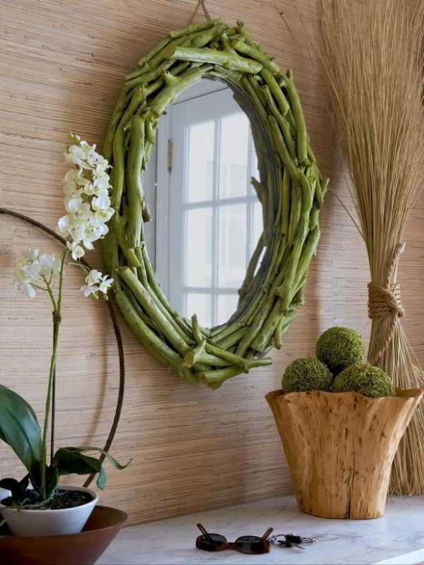 Часто ветками декорируются настенные зеркала. Их можно наклеить по всему периметру перпендикулярно раме или вдоль нее. Вариантов может быть множество. Умельцы легко делают из обрезков тонких стволов рамки под фотографии, детские рисунки, репродукции любимых картин.