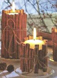 Еще один вариант сделать подсвечник, это просто взять толстую свечу и обклеить клеевым пистолетом веточками вокруг свечи. Также если ветки покрасить в золотой цвет, то эффект будет более гламурным.