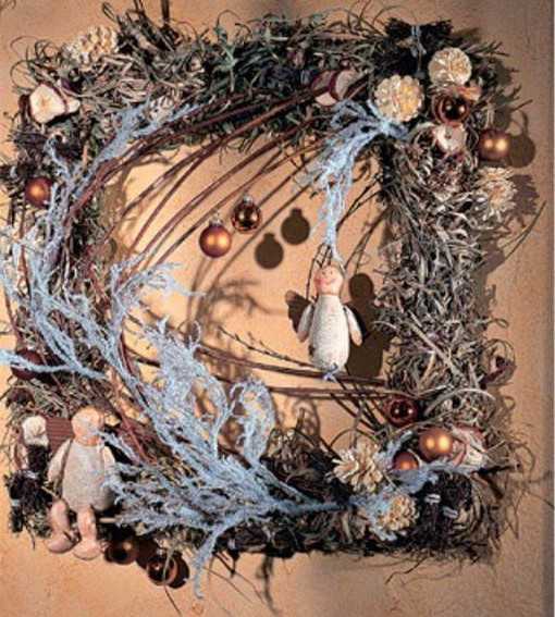 Интересно смотрится венок из веток на кухонном столе. В центр можно установить свечу или керамическую фигурку.