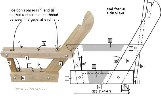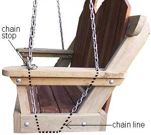 1. Создается верхняя связка из доски (115×10×5)2. Оформляется козырек (145×23×5), защищаемый металлические детали от дождя.3. Подготавливаются две стойки (275×23×5). Их стоит закопать не менее чем на 60 см, после чего забетонировать. Между стойками должно быть 105 см.4. Крепится нержавеющая стальная цепь.5. Изготавливается сиденье (60×15×5)