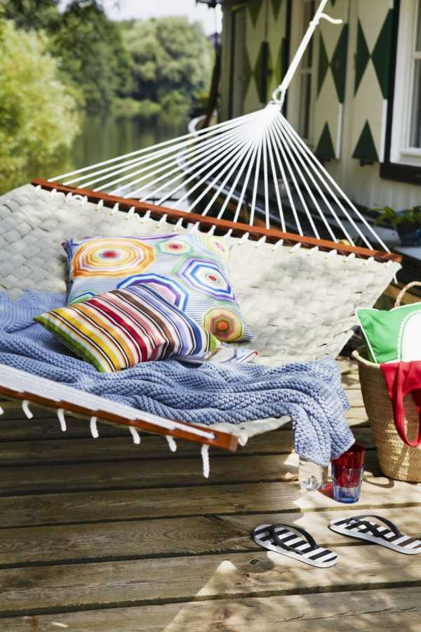Покажите нам человека, который отказался бы от гамака на даче! Его можно подвесить к деревьям, на металлические столбы или перекладину. Максимальная нагрузка составляет 200 кг.