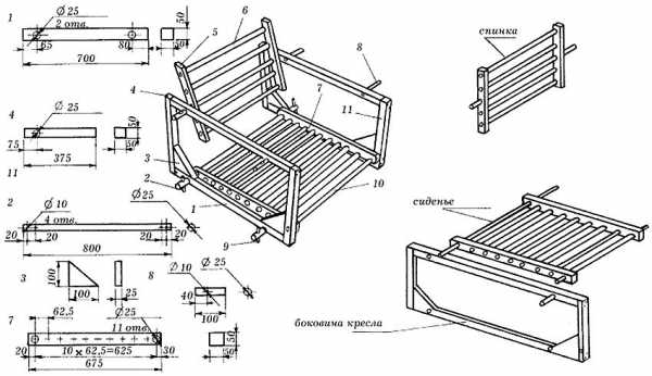 К примеру, понадобятся бруски для стоек, доски для спинки, сиденья и подлокотников. Также следует запастись крепежными элементами. Лучше, если для создания конструкции будет выбрана сосна, пропитанная специальными составами.