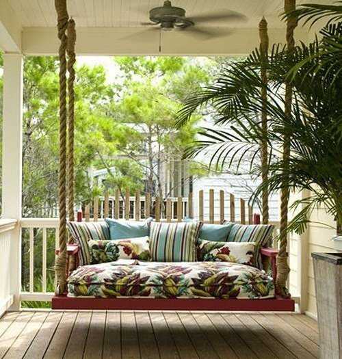 Впрочем, зачем лишать себя удовольствия дома. Если у вас большая веранда с крепким перекрытием, можно сделать качели и там, например, в виде подвешенного дивана. Наверно приятно подремать на свежем воздухе на мягких подушках