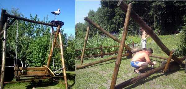 По такому же принципу собраны качели своими руками из бревен: боковые скреплены накрест, а сверху уложено опорное бревно. Если брус иногда собирают на гвозди, то в случае с бревнами используют в основном шпильки.
