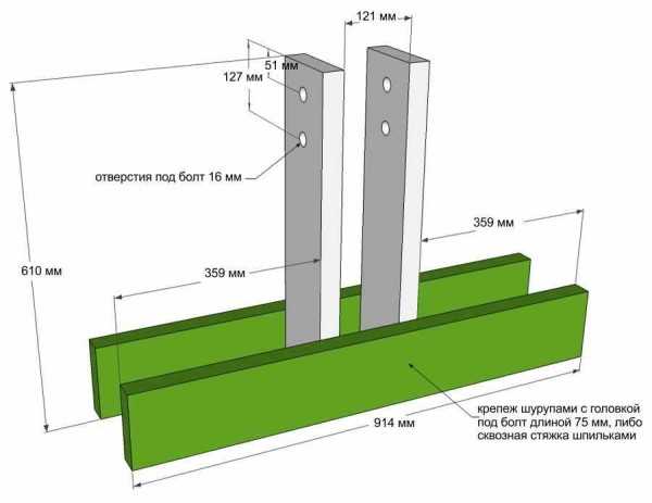 Все понятно, могут возникнуть вопросы только по узлу крепления. Ниже чертеж с указанием размеров. Для украпления верхней части внутри закрепляются стальные пластины. Чтобы они качались, сверлится отверстие, в которое продевается штырь. Улучшить «качение» можно вставив подшипники.