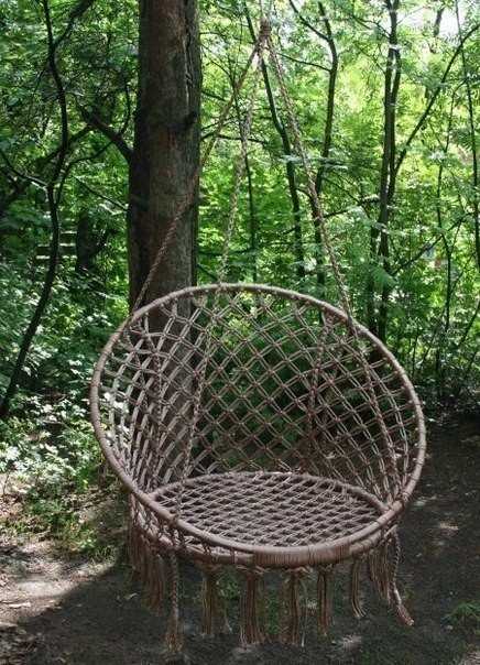 Если захочется побыть в одиночестве и поразмышлять на природе о чем-то вечном, покачиваясь в уютном кресле, соорудите себе такое кресло-качель. Согласитесь, есть в нем что-то винтажное, а бахрома с кистями настраивает на поэтический лад.