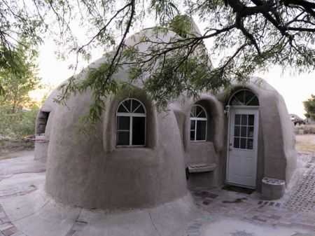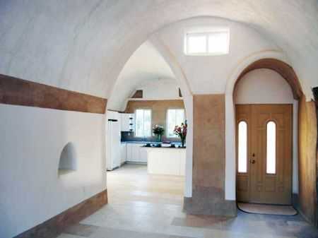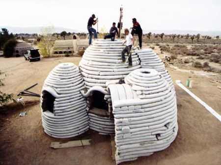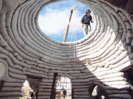 В предыдущей статье мы рассматривали вопрос, какой дом строить и выбирали строительную систему. Сейчас же поговорим о том, как быстро построить дом из подручных (точнее подножных) материалов. Нет, если Вы успели прочесть статью об английском малобюджетном доме, смело читайте далее — повторяться не будем: речь пойдет о… мешках с обычным грунтом. Да, да — обыкновенных полипропиленовых мешках из-под сахара. И обыкновенном грунте, что находится под слоем дерна (если он, конечно есть — дерн). Технологии возведения различных сооружений из мешков с песком уже не одна сотня лет. Так во время паводка очень быстро строили дамбы, а в революцию — баррикады и пулеметные гнезда. Но мы будем использовать обычный суглинок — самый распространенный вид почвы в средней полосе и сугубо в мирных целях. Перед строительством нужно запастись мешками, лопатой, бетономешалкой, цементом (если глины в грунте маловато) и парой помощников или помощниц (желательно симпатичных). В Америке вместо мешков частенько применяют полипропиленовый рукав, что сути строительства не меняет. Также желательно иметь План. Или его подобие, чтобы не забыть построить туалет или ванную комнату. Итак, быстро строим дом: Подготовка площадки Снимаем дерн с того места, где будет стоять дом. Размечаем площадку: колышком на веревке рисуем окружности основания стен. Дом будет круглым или почти круглым. Копаем траншею на глубину полметра и засыпаем ее сначала крупным щебнем, потом мелким и, наконец, песком. Все трамбуем. Укладываем гидроизоляцию: раскатываем рубероид (лучше в два слоя). Подготовка грунта (для мешков) Грунт с малым содержанием глины, даже если его немного смочить, рассыпается. Добавляем цемент, слегка смачиваем, лепим «снежок», если держит форму — хорошо, запоминаем пропорции компонентов смеси. Если рассыпается, добавляем еще цемент, пока комок не будет сохранять форму. Потом смесь для наполнения мешков будет замешиваться в бетономешалке с целью ускорения процесса строительства дома. Возведение стен Здание имеет сферическую или близкую к ней форму. Стены плавно сужаются и переходят в кровельный свод. Такая конфигурация строения позволяет обойтись без потолка, стропил, обрешетки, шифера и пр. А самое главное — без денежных затрат на все вышеперечисленные материалы. Сфера имеет минимальную площадь при максимальном объеме. Экономия налицо. Плюс к этому сферическая конструкция дома позволяет равномерно распределить на основание нагрузку от веса стен, снега, ветра и атомной бомбы. В сферической кладке блоки работают только на сжатие, но не на изгиб. Что нам только на руку. Наполняем мешки готовой смесью. Заворачиваем горловину мешка вниз. Кладем мешки по окружности, с каждым последующим рядом уменьшая ее диаметр. В этом поможет веревка, привязанная к колышку, вбитому в центр окружности (центр дома). Не забываем про проемы, в которые устанавливаются сначала деревянные шаблоны, а потом оконные и дверные коробки. Чтобы впоследствии не мучиться с установкой коробок, между мешками помещаем отрезки толстых досок (закладные). Перед укладкой следующего ряда, только что положенные мешки трамбуются ручной трамбовкой, пока не станут твердыми. Лучше придавать им слегка клиновидную форму, как каменщик кирпичам в арках. Чтобы мешки не соскальзывали во время трамбовки, между рядами