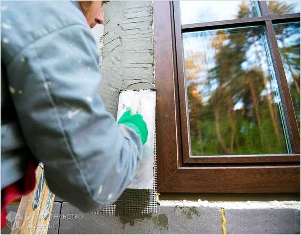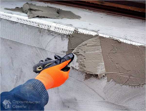 При выставлении маяков, следует учитывать, что оконный проем должен иметь некоторую разуклонку во внутреннюю часть комнаты. Штукатурка наноситься снизу вверх по откосу. Для того, что бы штукатурка лучше держалась на стене, рекомендуется произвести армирование специальной сеткой, зафиксировав ее на основании перед началом нанесения штукатурки.