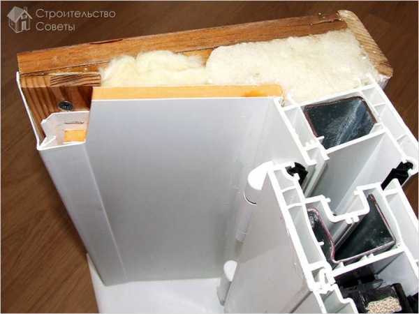 В паз устанавливается стартовый профиль. К нему впоследствии фиксируется откос, а затем утепляется. При этом утеплитель укладывается под пластик. Внешний край откосов следует закрепить к стене саморезами или дюбелями.
