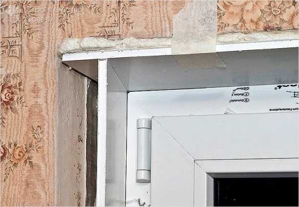 3. Установка сначала верхнего, а затем двух боковых откосов (панели вставляются в паз стартовой полосы и приклеиваются при помощи монтажной пены и скотча).