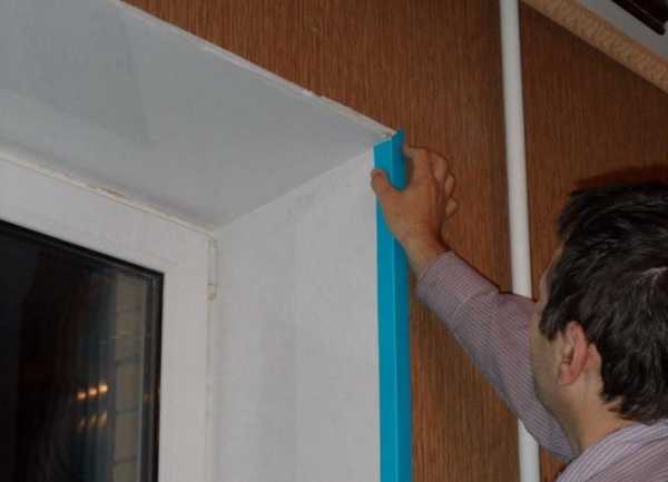 устанавливаем F-образный лицевой профиль и крепим его скотчемЧтобы избежать подобных неприятностей, следует укладывать пену слоями, начиная от самого основания. Далее необходимо запенить места стыков панелей и углы профилей. Далее вставляются F-образные профиля в получившееся пространство и фиксируются скотчем. После 15-20 минут пена полностью застынет и заполнит все пространство между панелью и откосом. Теперь можно приступить к замазыванию щелей силиконом, либо герметиком. Чтобы монтажная пена хорошо схватилась с поверхностью старых откосов, желательно предварительно ее смочить обычной водой.