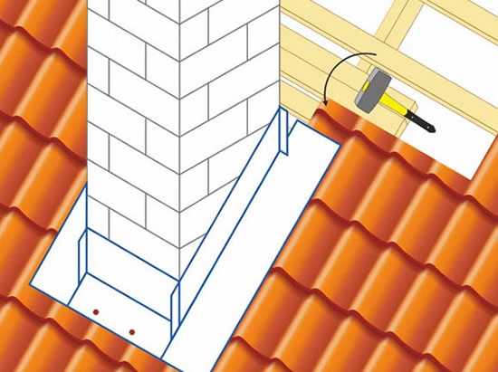 Вокруг труб необходимо установить дополнительные доски обрешетки, таким образом, чтобы покрытие было сплошным. На расстоянии 15 см от верхней поверхности трубы необходимо обрезать примыкающую к трубе металлочерепицу. Рез располагается на 8 см выше линии штамповки.