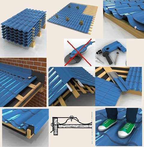 Металлочерепица материал достаточно прочный, но при неправильной технологии монтажа или при неаккуратном обращении с ним, может быть повреждено защитное покрытие, а это приведет к быстрому разрушению материала. Вот основные правила работ: