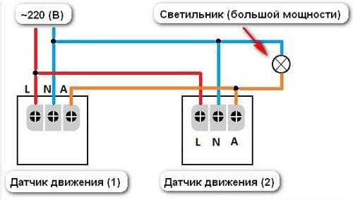 К одному прожектору также получится подвести несколько сенсоров, если к освещаемому месту есть несколько подходов, которые не удается перекрыть зоной охвата одного прибора. В этом случае датчики подклю
