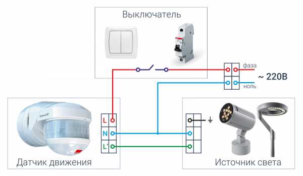 Прожектор с датчиком движенияВ конструкцию этого устройства входит светильник с лампой (накаливания, галогенной или светодиодной), к которому прикреплен инфракрасный датчик движения. Также оно оснащено кронштейном для крепления (в наборе к нему, как правило, идут дюбеля и саморезы).Подключение прожектора с датчиком движенияВ комплекте к приобретенному прожектору должна идти инструкция по его подключению, но если вы ее не обнаружили, не отчаивайтесь, ведь подключение этого прибора достаточно просто: