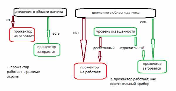 Алгоритм работы прожектора зависит от того, для чего должен зажигаться свет: в случае проникновения или для освещения участка при проходе в темное время суток.