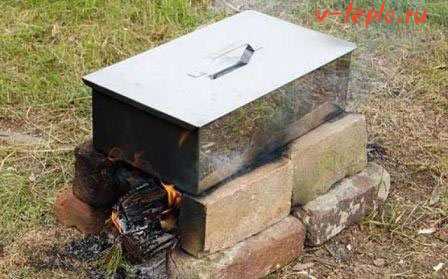 Внешне такое устройство напоминает металлический чемодан заданного размера. Внутри коптильни приварены уголки, на которые устанавливаются решётки.