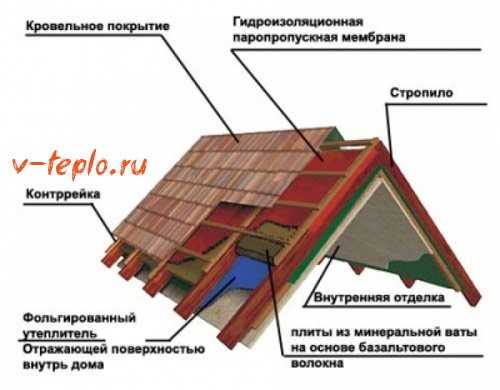 Как правильно утеплить мансарду? Чтобы провести самостоятельно утепление мансарды изнутри необходимо четко представлять себе строение кровли, наиболее распространенной конструкции. Поэтому, перед тем как привести рекомендации по методам утепления верхнего этажа, напомним описание «слоеного пирога», из которого состоит конструкция кровли: