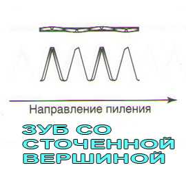Передняя кромка зубьев перпендикулярна направлению движения. Заточка с двух сторон. Позволяет сносно работать как вдоль, так и поперек волокон. Не отрабатывает на 100% при любом распиле, но позволяет сэкономить на покупке двух экземпляров.