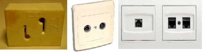 Номенклатура современных розеток не исчерпывается лишь силовыми устройствами. Широко представлены и телекоммуникационные изделия, их иногда еще называют слаботочными розетками. Наиболее известны из них розетки для подключения телефонных аппаратов и радиорепродукторов. Несколько реже пока спользуются устройства, обеспечивающие подключение телевизора к скрытно проложенному антенному кабелю и розетки для компьютерной связи.