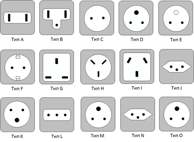Они (типы розеток и вилок) обозначаются буквами, наиболее распространен и универсален – это без наличия заземляющего контакта европейский тип C, так называемый «Europlug», который является универсальным для распространенных до сих пор советских C1/C, а также европейских с заземлением – французского E и немецкого F.
