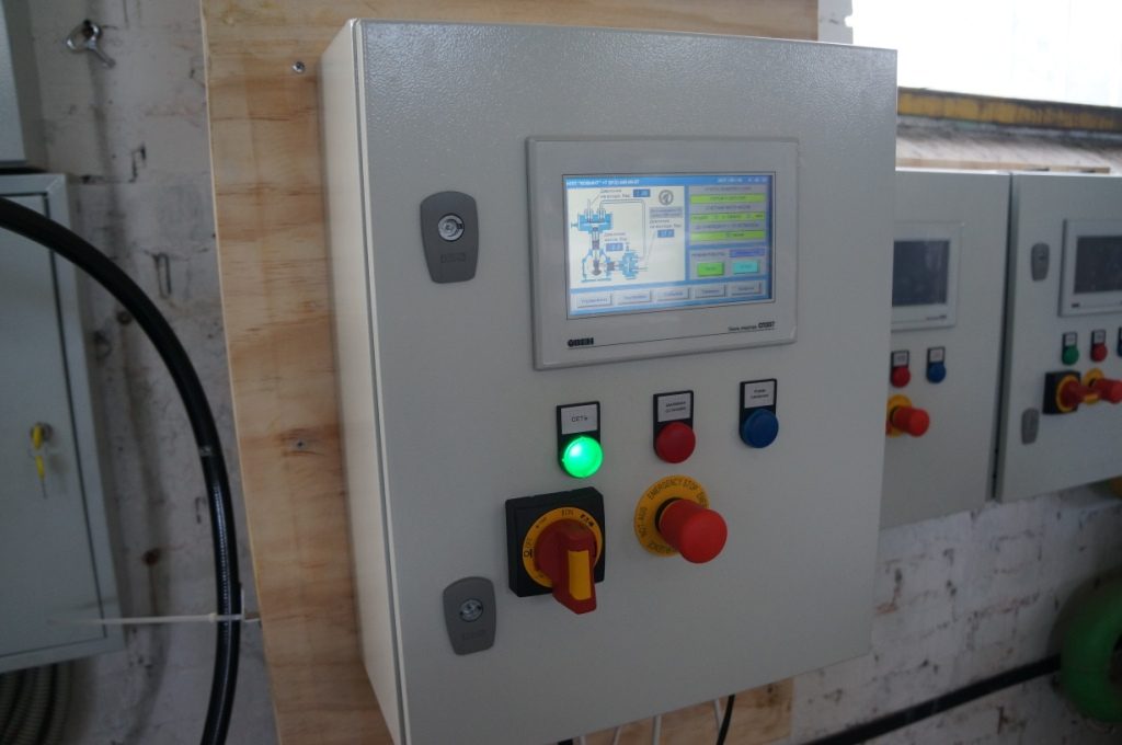 На лицевой стороне панели управления установлена сенсорная панель оператора Овен СП307-Б (Россия).