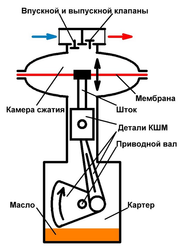 Но даже из такой, казалось бы, простейшей схемы становится очевидным главное отличие мембранных компрессоров от компрессоров поршневых – камера сжатия герметично отделена от картера компрессора.