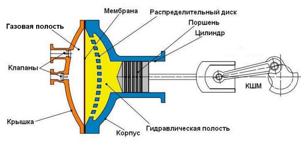 Возвратно-поступательные движения поршню передаются через КШМ. В свою очередь, поршень через слой гидравлической жидкости воздействует на мембрану, заставляя ее совершать колебательные движения.