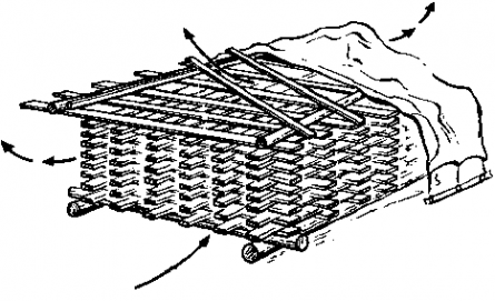 При их складировании старайтесь, чтобы между ними оставалось свободное пространство около 5 мм что даст им возможность проветриваться. Это позволит древесине избавиться от лишних запасов влаги. Все древесные материалы следует обработать антисептиками (кроме тех что Вы планируете использовать, например, для опалубки). Сверху их нужно накрыть полиэтиленовой пленкой или рубероида.