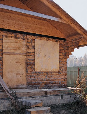Проемы для дверей и окон на зиму закрываются листами металла, фанерой или досками, а для лучшей защиты – еще и полиэтиленовой пленкой.