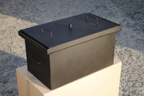 Стационарная домашняя коптильня иногда сооружается из листа железа. В данном случае потребуется запастись сварочным аппаратом и инструментами для работы с металлом. Нам потребуется разрезать железный лист в соответствии с размерами (запланированными) устройства. Затем согнуть его так, чтобы получился куб, у которого нет верхней части. И сварить все швы конструкции.