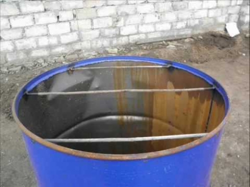 Для монтажа поддона необходимо приварить к стенам камеры несколько отрезков арматуры. У нас должна получиться конструкция в виде креста. Его центр обязан совпадать с центральной частью бочки. Специалисты советуют снабдить поддон петлей. Тогда при необходимости чистки его будет несложно достать.