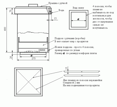 По бокам коптилки можно установить дополнительные ручки, для удобства переноса и установки на огонь. Такую коптилку можно использовать как на открытом огне – костре или газу, так и разогреть ее с помощью простой бытовой электроплитки. В последнем случае время готовки может быть увеличено, в зависимости от мощности электроприбора. Не рекомендуется использование коптилок на дорогих электрических плитах, так как дно в процессе нагрева может деформироваться и повредить плиту.Со временем, если объемы заготавливаемых продуктов увеличатся, можно изменить размеры изделия, для этого к уже имеющимся чертежам нужно пропорционально добавить несколько сантиметров. Чертежи помогут не только сделать ровную красивую конструкцию, но и помогут определиться с расчётом материалов. Для создания чертежа своими руками можно воспользоваться фото- или видео-материалами.