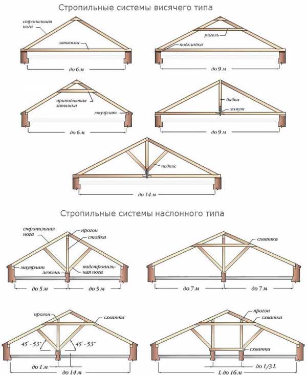 Устройство висячих и наслонных стропиль двускатной крыши.Четырехскатная крыша