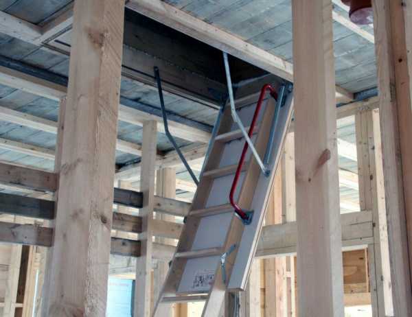 Металлическая чердачная лестница с деревянными ступенями и люком