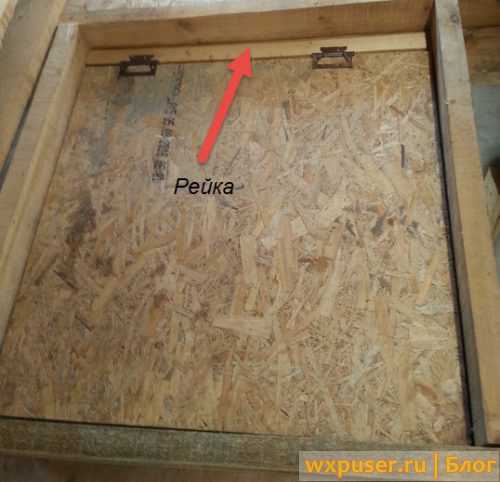 Саму крышку люка, я вырезал из ОСБ 3, петли использовал простые дверные, закрепил все на саморезы. Для того что бы утопить петли, подложил под них рейку толщиной 10 мм, ОСБ имеет 9 мм.