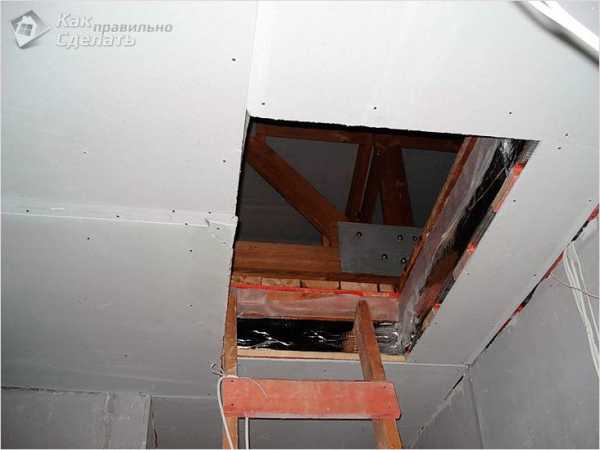 Выпиленная часть покрытия потолка может быть использована в качестве отделки крышки люка. Получившийся в результате проем следует усилить балками.
