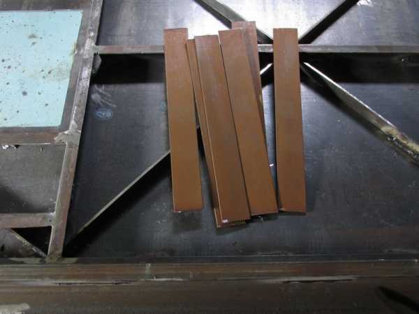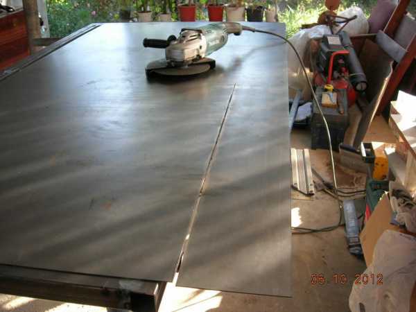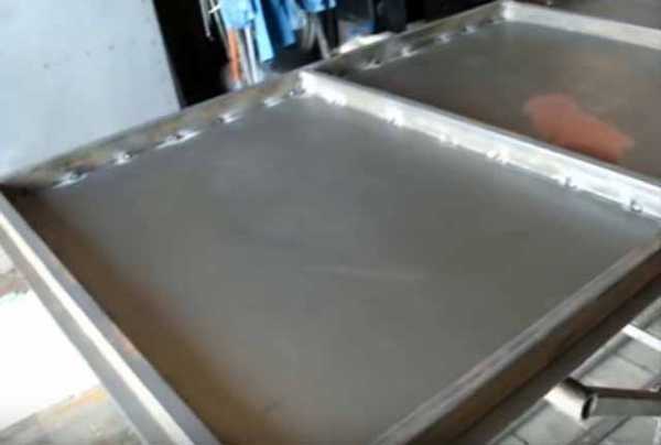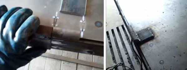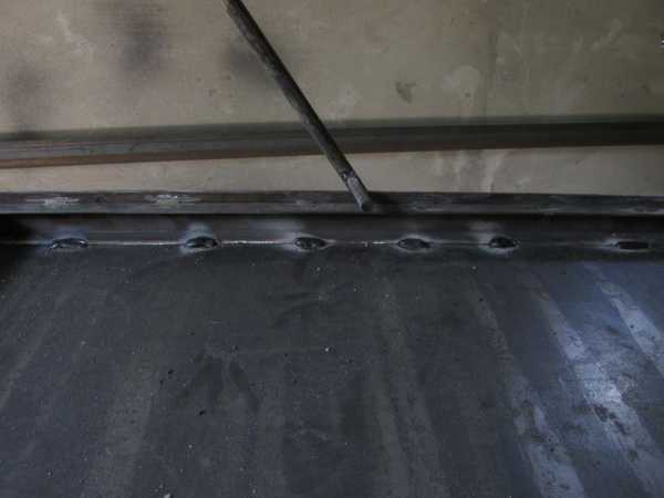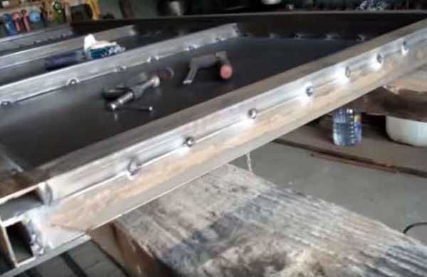 Сварка листа и каркаса проводится тонкими электродами диаметром 2 или 2,5 мм. Ни в коем случае не используйте электроды диаметром 4 или 5 мм. Сварка осуществляется в одном направлении — постепенно прижимая лист к каркасу. Длина сварочного шва должна быть не больше 1,5-2 см. При этом расстояние между швами должно быть 5-6 см. При сваривании листа и трубы сварка делается с двух сторон трубы в шахматном порядке.