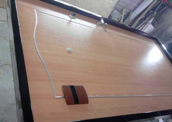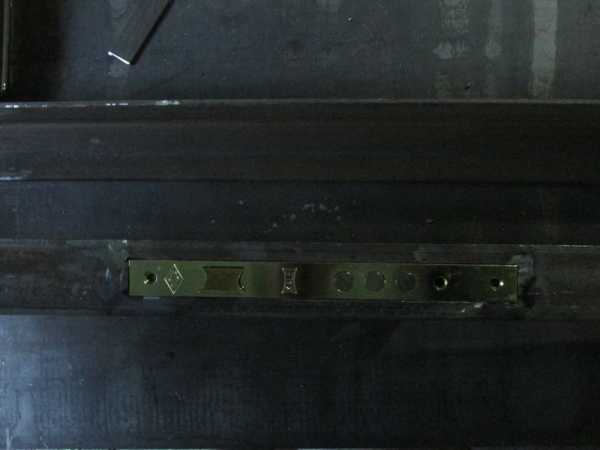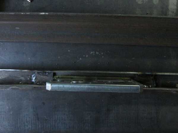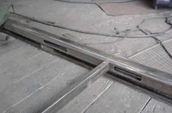 После сварки петель и направляющей приступают к сварке каркаса самой двери. Дверной блок размещают горизонтально, на ровной поверхности. При помощи уровня проверяется его положение. Трубы, разрезанные по размеру при помощи деревянных дощечек, выкладываются по уровню внутри блока. Зазоры между каркасом двери и блоком устанавливаются при помощи деревянных клиньев или пластиковых крестиков для монтажа кафельной плитки.Установка замка и запорной фурнитуры
