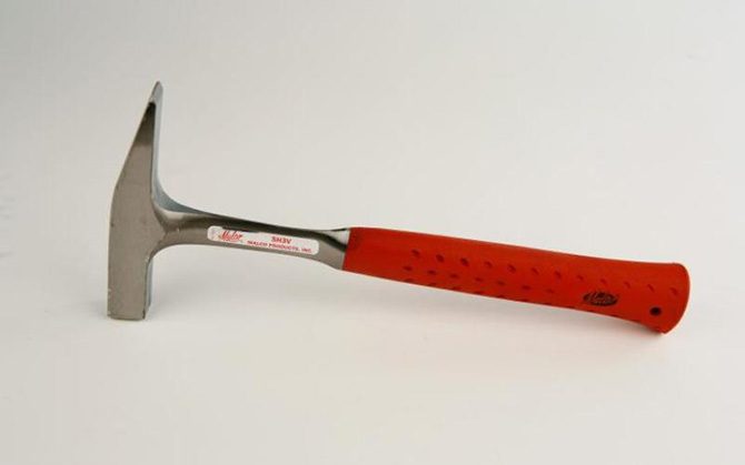С одной стороны это топор для обломки кусков скалы. Плоская головка предназначена для разрушения мелких пород. Каменщики с помощью этого молотка освобождают в кирпичной кладке швы. Его вес составляет 1 килограмм.