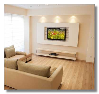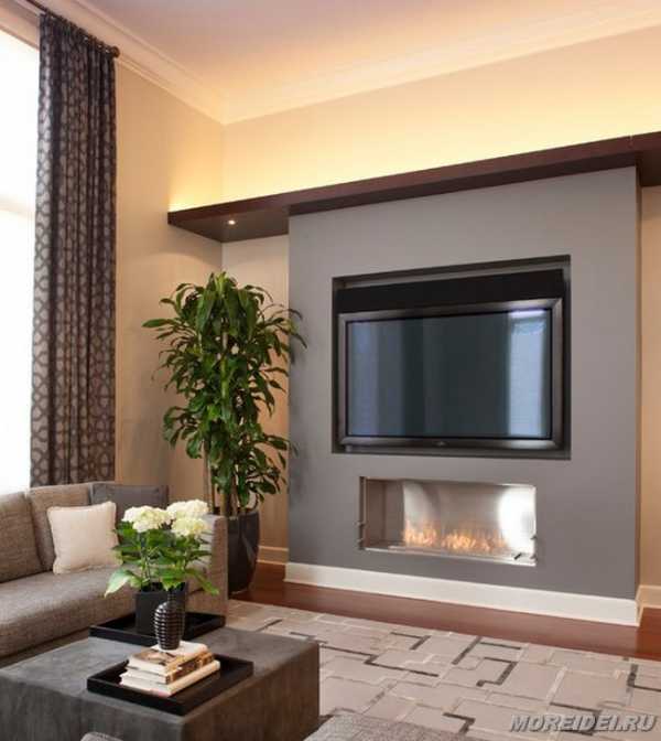 С целью камуфлирования антенных и электрических ТВ проводов, а также для придания более эстетичного вида всей комнате, телевизор часто крепят в заранее сформированном декоративном углублении.