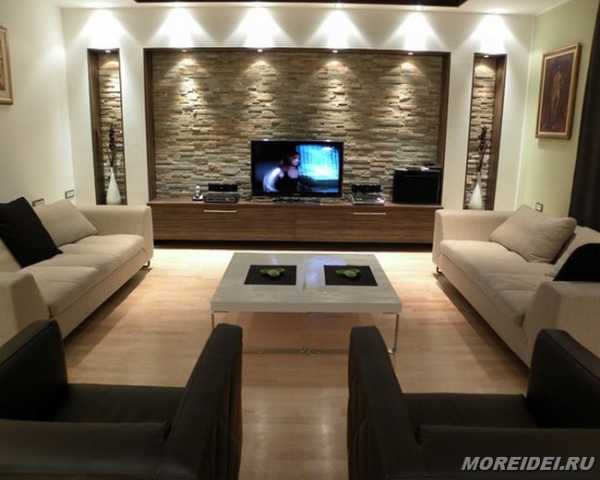 Используют точечные лампы в нижней или верхней части ниши. Хорошо смотрится диодная подсветка в роли светомузыки. Приятно освещение, направленное сверху вниз. Используют декоративный камень, фотообои или покрывают поверхность конструкции краской разнообразных оттенков, гармонирующих с цветовым тоном стены. Обустраивают стену нишами для колонок телевизора и другой аудиосистемы. Под плазменной панелью имитируют камин. Выделяют место для полок под красивые вещицы – шкатулки, статуэтки, книги в оригинальных переплетах.
